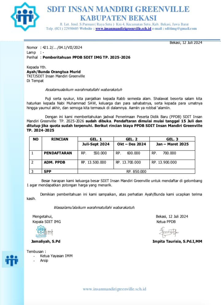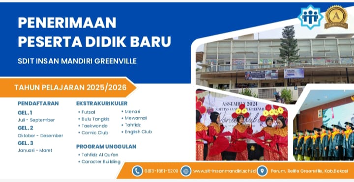 Secara resmi telah di buka Pendaftaran peserta didik baru SDIT INSAN MANDIRI GREENVILLE dan akan ditutup sampai kuota terpenuhi.